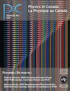 Nous sommes sur le point de publier le premier numéro de La Physique au Canada pour 2025, vol. 81(1), qui contient des articles liés au congrès de 2025, des articles soumis par notre communauté et des nouvelles de la communauté. Le volume 81(2) paraîtra au début de l’année 2026. Il s’agira d’un numéro spécial consacré à l’Année internationale de la science et de la technologie quantiques (IYQ), qui s’achèvera officiellement en février 2026, et qui mettra l’accent sur les travaux passionnants menés dans les domaines liés à la physique quantique à travers le Canada. Les rédacteurs invités pour ce numéro spécial sont John Donohue (IQC), Ben Newling (UNB), et Julien Ross (Dalhousie). Notre premier numéro de l’année prochaine, le 82(1), sera un numéro spécial consacré à la physique, au climat et à l’environnement. Les rédacteurs invités sont Pierre Bénard (UQTR), Jake Breen (MUN), et Kris Poduska (MUN).